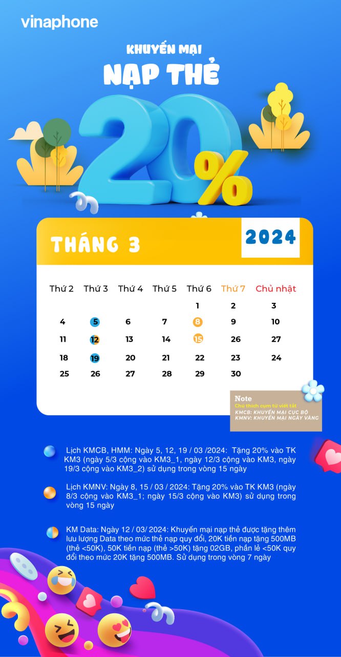 Trong tháng 3/2024, VinaPhone ưu đãi tặng ngay 20% giá trị thẻ nạp cho thuê bao trả trước. Chi tiết lịch khuyến mại nạp thẻ trong tháng như sau:
