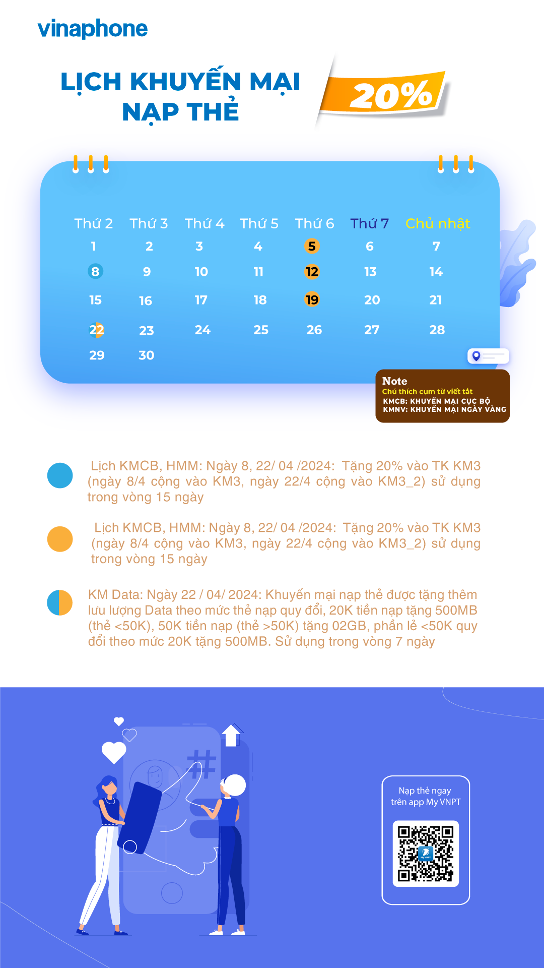 Trong tháng 4/2024, VinaPhone ưu đãi tặng ngay 20% giá trị thẻ nạp cho thuê bao trả trước. Chi tiết lịch khuyến mại nạp thẻ trong tháng như sau: