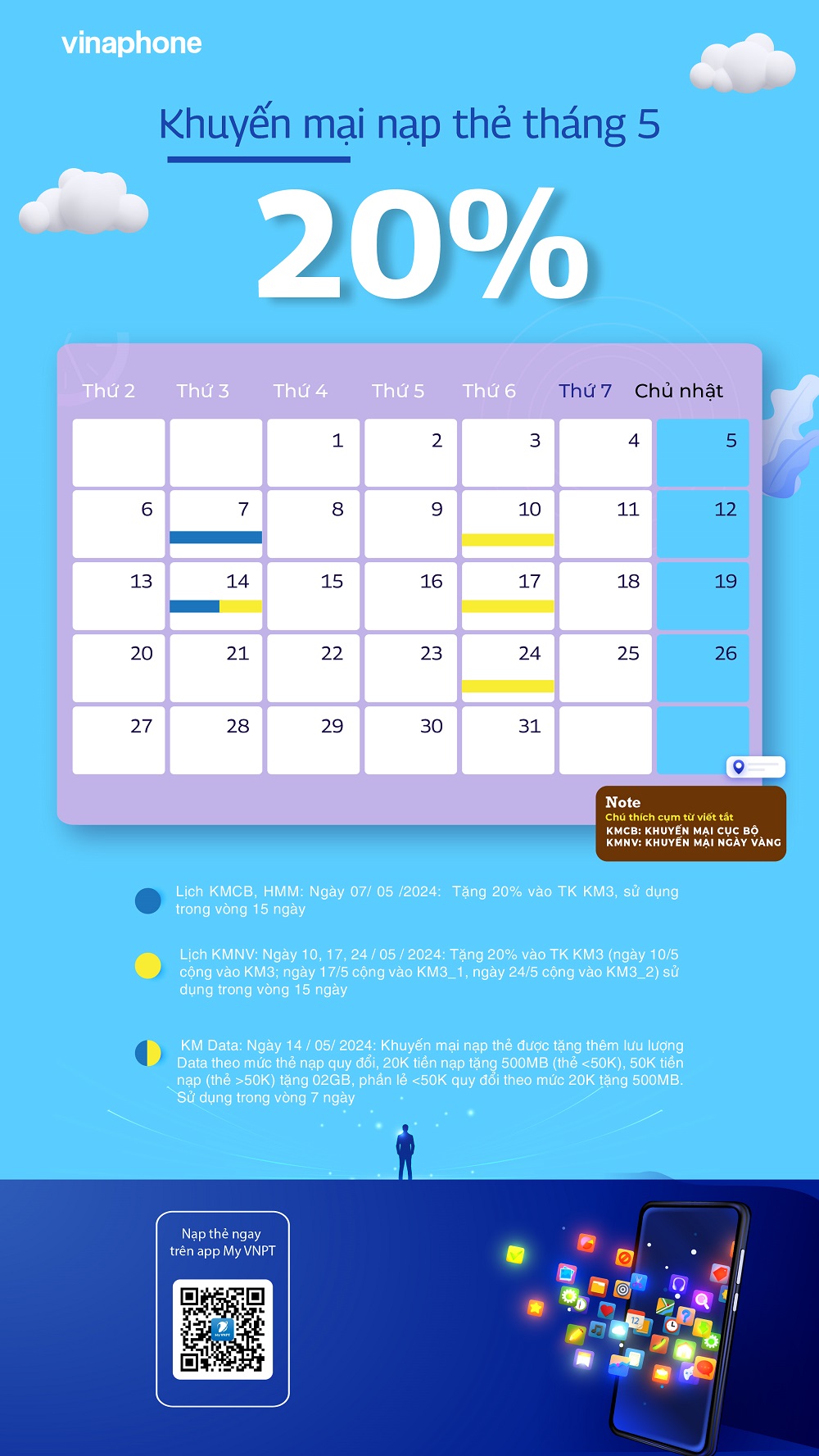 Trong tháng 5/2024, VinaPhone ưu đãi tặng ngay 20% giá trị thẻ nạp cho thuê bao trả trước. Chi tiết lịch khuyến mại nạp thẻ trong tháng như sau:
