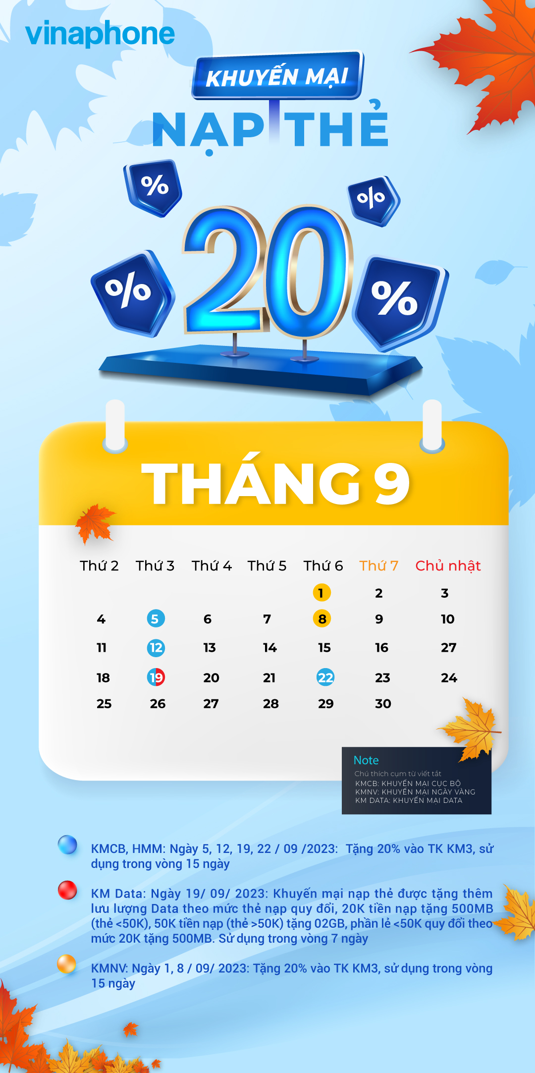 Trong tháng 9/2023, VinaPhone ưu đãi tặng ngay 20% giá trị thẻ nạp cho thuê bao trả trước. Chi tiết lịch khuyến mại nạp thẻ trong tháng như sau: