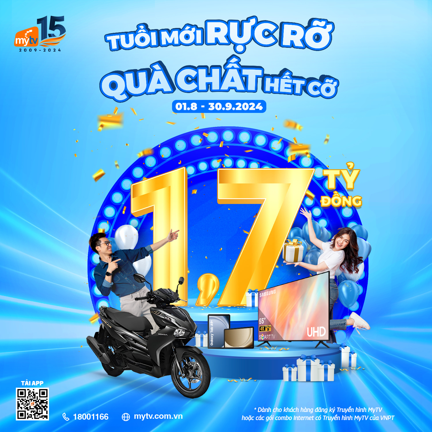 Mừng dấu mốc kỷ niệm 15 năm ra mắt dịch vụ, Truyền hình MyTV triển khai chương trình khuyến mại tri ân khách hàng với tổng trị giá gần 1,7 tỷ đồng. Chương trình diễn ra từ ngày 01/8 đến ngày 30/9/2024.