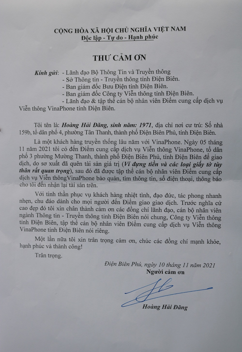 Sau khi phát hiện khách hàng để quên ví bao gồm tiền và các giấy tờ tùy thân quan trọng, nhân viên VinaPhone địa bàn Điện Biên đã tìm cách liên hệ và trao trả lại. Mới đây, vị khách hàng này đã có thư cảm ơn tới VinaPhone.