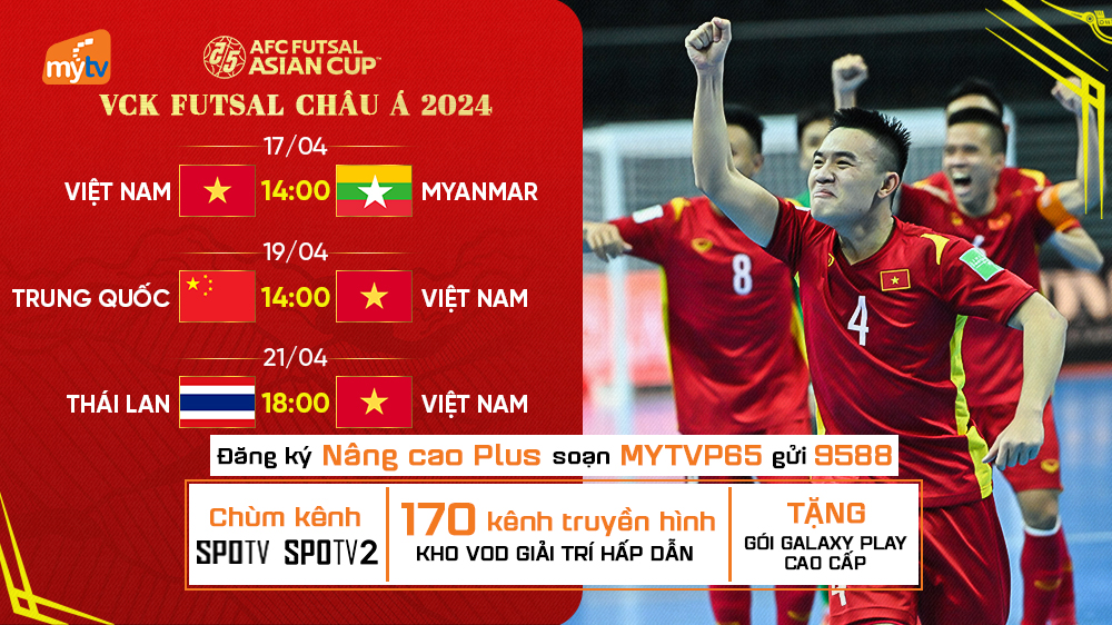 Bên cạnh giải U23 châu Á 2024, dịch vụ truyền hình MyTV của Tập đoàn VNPT còn gửi tới khán giả trọn vẹn vòng Chung kết Futsal châu Á 2024 diễn ra từ ngày 17-21/4/2024. Tại giải đấu này, tuyển Việt Nam đặt mục tiêu đứng trong top 4 đội mạnh nhất để cạnh tranh tấm vé dự Futsal World Cup 2024.