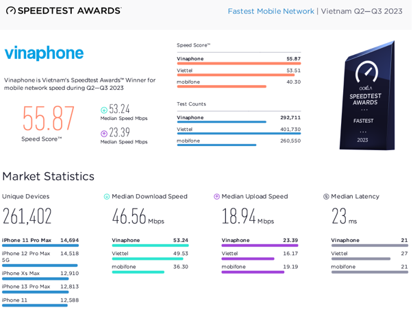 Đây là kết quả được Speedtest tiến hành tính toán dựa trên những lượt đo kiểm do chính những người dùng sử dụng các mạng viễn thông lớn tại Việt Nam thực hiện đo kiểm, đánh giá bằng thời gian thực thông qua ứng dụng Speedtest trên nền tảng iOS và Android. Kết quả này cũng không có nhiều bất ngờ khi liên tục trong 3 quý đầu năm 2023 (Quý I, Quý II và Quý III), mạng di động VinaPhone liên tục đạt được điểm số tốc độ cao nhất trên thị trường Việt Nam, tương đương 55.87 điểm.