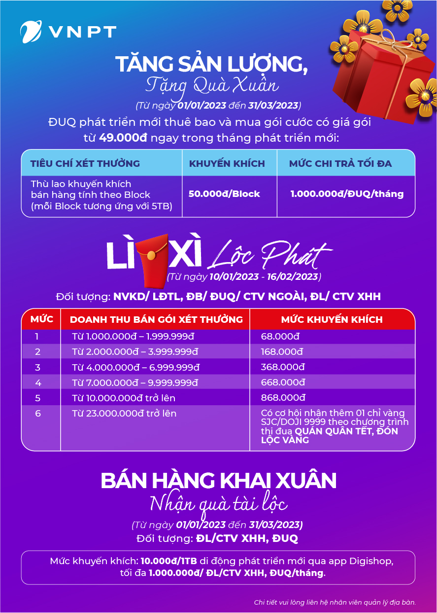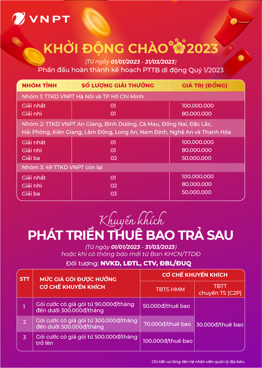 Khởi động chào 2023, VinaPhone tung nhiều chương trình khuyến khích bán hàng với các mức hoa hồng và tặng thưởng hấp dẫn dành cho tất cả NVKD, CTV, Điểm bán ... Các chương trình được diễn ra xuyên suốt trong Quý 1/2023 như sau: