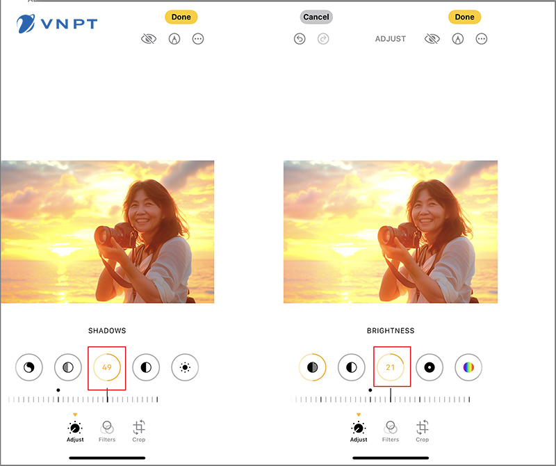 Sau khi điều chỉnh xong, bạn kích vào Done (Xong) để lưu ảnh đã chỉnh sửa.