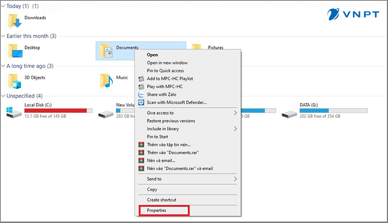 - Bước 2: Chuột phải vào thư mục cần chuyển (ví dụ: Documents) và chọn Properties.