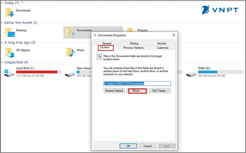 - Bước 3: Trong cửa sổ Properties, chọn tab Location, sau đó nhấn nút Move để chọn vị trí mới trên ổ D.