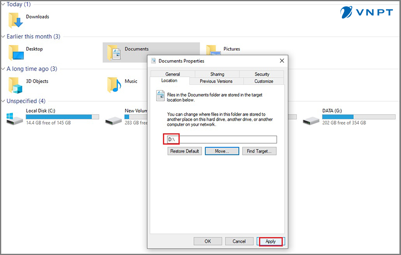 - Bước 4: Chọn ổ D hoặc thư mục trên ổ D mà bạn muốn di chuyển thư mục đến, sau đó nhấn Apply để xác nhận.
