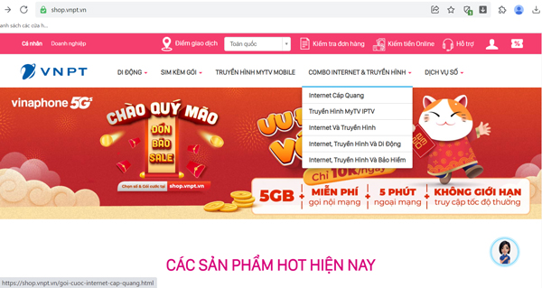 - Bước 1: Bạn truy cập vào địa chỉ https://shop.vnpt.vn/, tab “Cá nhân”, “COMBO INTERNET & TRUYỀN HÌNH”. Sau đó, tùy theo nhu cầu, bạn chọn mục “Internet Cáp Quang”/ “Internet & Truyền Hình”/ “Internet, Truyền Hình và Di Động”/ “Internet, Truyền Hình và Bảo Hiểm”.