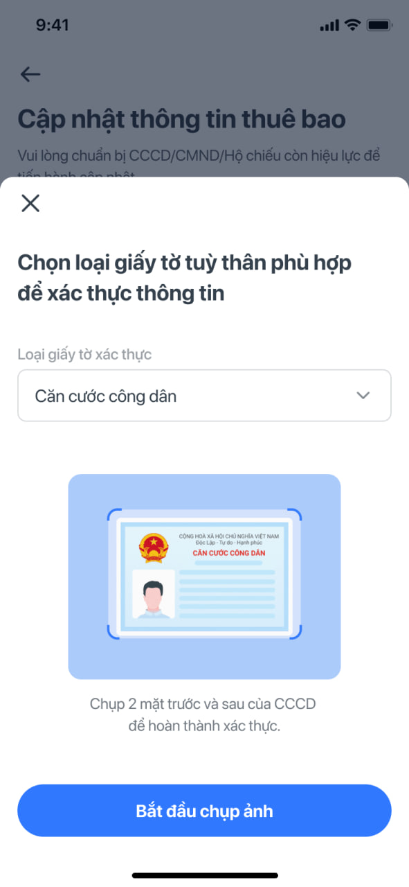1. Nếu thông tin thuê bao chưa đúng hoặc cần cập nhật thông tin mới theo CCCD, Khách hàng chọn “Cập nhật” |