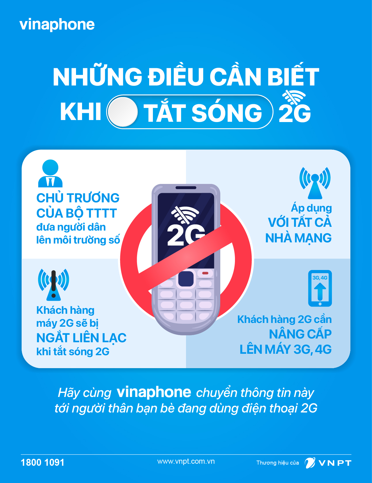 Là một trong những nhà mạng uy tín hàng đầu Việt Nam, sở hữu mạng lưới viễn thông và cơ sở hạ tầng hiện đại, rộng khắp, kết nối toàn thế giới, VinaPhone đã sẵn sàng cho việc tắt sóng 2G và đảm bảo mọi quyền lợi cũng như những trải nghiệm tốt nhất cho khách hàng. Nếu bạn là thuê bao di động của VinaPhone, bạn có thể gọi hotline 18001091 để biết thêm thông tin chi tiết.