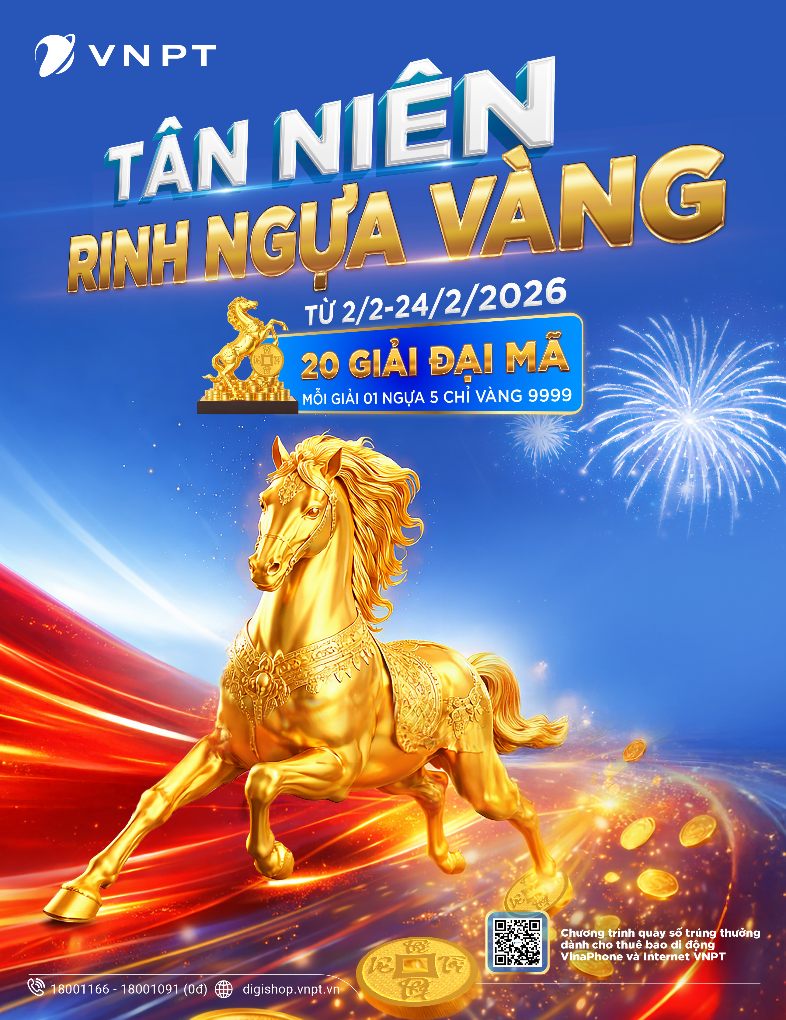 Dịp Tết Nguyên Đán 2026 này, VNPT mang đến Lộc Xuân cực lớn cho khách hàng trên toàn quốc với chương trình khuyến mại "Tân Niên Rinh Ngựa Vàng". Chỉ cần đăng ký, gia hạn, nâng cấp gói cước VinaPhone từ 50.000đ hoặc gói Internet 1 tháng trở lên, khách hàng đã có cơ hội sở hữu Đại Mã 05 chỉ vàng 9999 trong ngày vía Thần Tài.