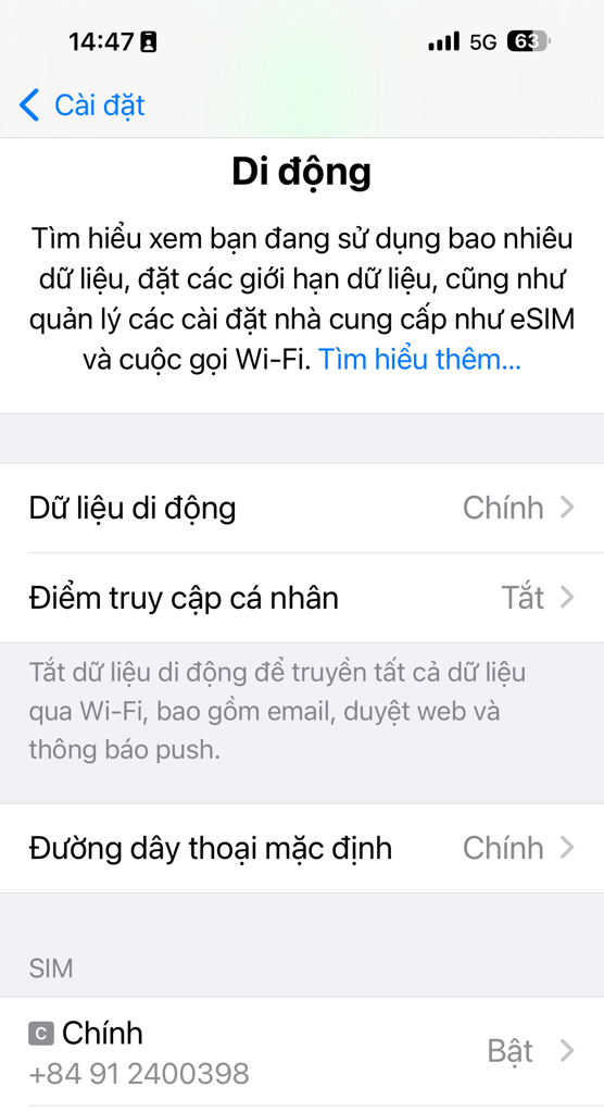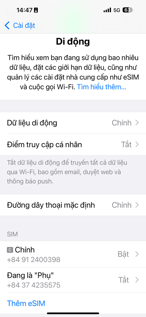 - Bước 8: Kết quả: eSIM sau khi được kích hoạt sẽ xuất hiện trong mục eSIM.