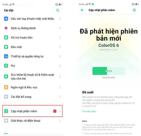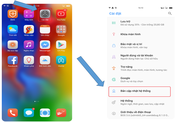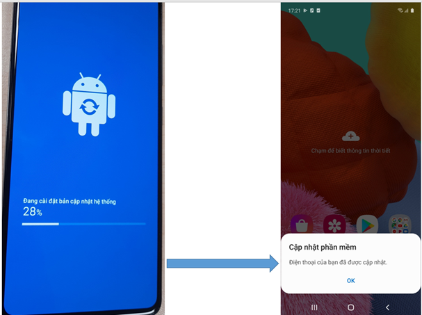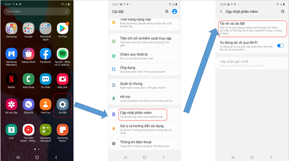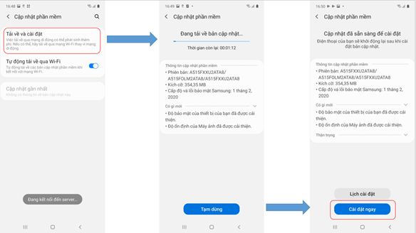 - Khách hàng vào phần “Cài đặt” của điện thoại – tìm đến phần “Cập nhật phần mềm” – chờ hệ thống phát hiện phiên bản mới, sau đó nhấn vào “Tải xuống”. Sau khi quá trình tải xuống kết thúc nhấn vào “Cập nhật ngay” tiến trình sẽ được thực hiện tự động và điện thoại sẽ khởi động lên sau khi hoàn thành.