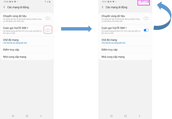 - Truy cập Cài đặt>VoLTE/VoWIFI và bật/tắt (tiếng anh Settings >VoLTE > ON or OFF VoLTE or VoWIFI).