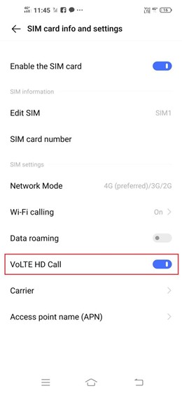 - Go to Setting –Mobile Network – SIM – VoLTE HD Call switch