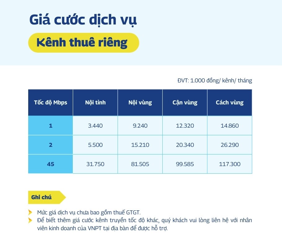 Dịch vụ kênh thuê riêng (còn gọi là leased line): là dịch vụ cho thuê đường truyền dẫn vật lý dùng riêng để kết nối và truyền thông tin giữa các thiết bị đầu cuối trong mạng nội bộ, mạng viễn thông dùng riêng của khách hàng tại hai hay nhiều địa điểm cố định khác nhau với các tốc độ theo yêu cầu cụ thể của khách hàng. Hiện VNPT cung cấp 2 loại hình kênh thuê riêng theo công nghệ là SDH và EoSDH với phạm vi kết nối cả trong nước lẫn quốc tế.