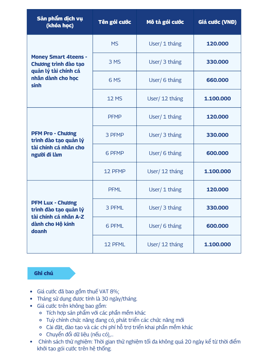 - PFM Pro - Quản lý tài chính cá nhân toàn diện dành cho người đi làm: được xây dựng nhằm hỗ trợ người lao động nâng cao năng lực quản lý tài chính cá nhân và tài chính gia đình theo hướng bền vững. Chương trình giúp học viên hình thành tư duy tài chính đúng đắn, làm chủ dòng tiền, sử dụng hiệu quả các nguồn lực tài chính và từng bước gia tăng tài sản trên cơ sở phù hợp với điều kiện thực tế.