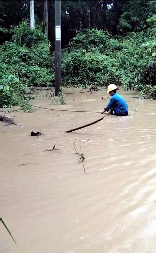 Nhân viên kỹ thuật của VNPT ngâm mình trong nước lũ để nối lại đường dây kết nối